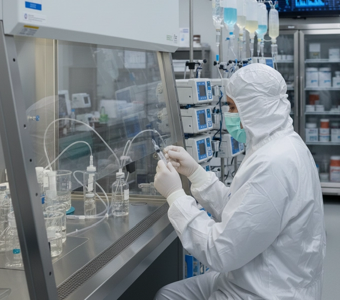 Customized sterile solutions for IV, IM, and SQ administration – compounded under aseptic conditions in ISO Class 5–7 cleanrooms with rigorous environmental monitoring and microbiological control.
